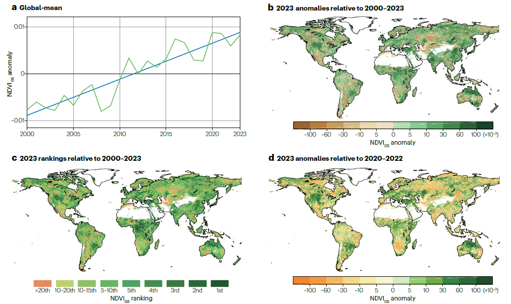 北京大学朴世龙院士团队2024年4月应邀在《自然综述:地球与环境》(Nature Reviews Earth & Environment)发表题为“Vegetation greenness in 2023”的文章,发现过去几十年全球植被变绿趋势在2023年仍在延续,2023年的全球植被绿度创下本世纪初以来仅次于2020和2021年的第三高,这主要归结于美国中西部、欧洲、澳大利亚北部和非洲萨赫勒地区植被生长的显著增强。但相比于2020和2021年,由于2023年全球多地遭遇了春季寒潮、夏季高温干旱等极端气候事件,致使俄罗斯、墨西哥、加拿大和热带等区域植被生长显著降低。对2023年植被绿度的回顾研究回答了全球植被长期变绿趋势是否会因全球广泛发生的极端气候事件而停滞的争论,同时强调了未来持续变暖趋势下极端气候事件的频发会加剧植被呈区域性衰退的特征,从而削弱生态系统碳汇功能。